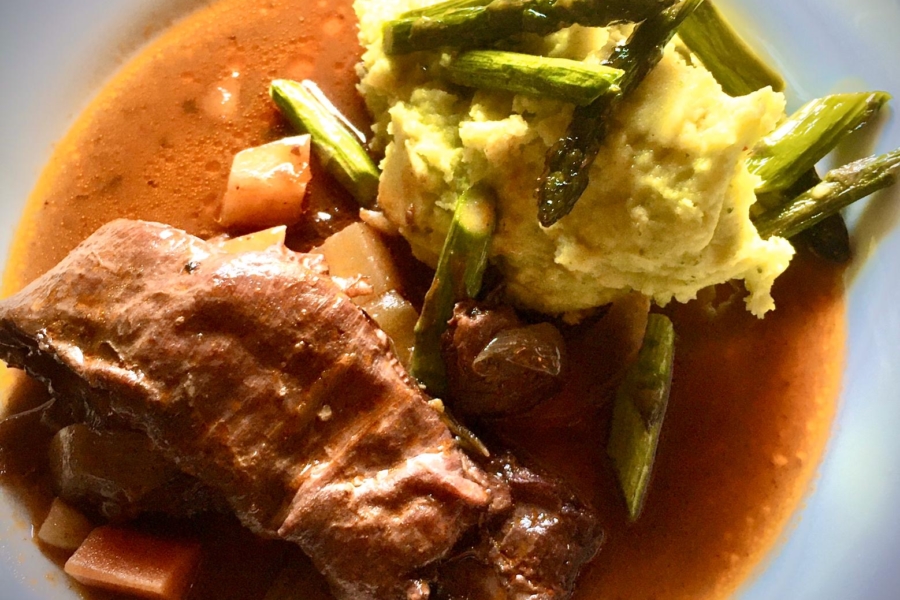 Falls vorhanden, Knochen oder Teile der Dünnung ebenso anbraten, würzen, beiseite stellen. In der Zwischenzeit das bereits vorbereitete und gewürfelte diverse Wurzelgemüse im selben Bratentopf anbraten, tomatisieren und mit Rotwein und Gemüsebrühe oder auch Lammfond ablöschen und würzen. Angebratene Knochen und andere Rest-Fleischteile zugeben und mit Wein und/oder Brühe auffüllen und bei mittlerer Temperatur schmoren.